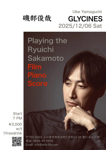 お知らせ カフェLIVEのご案内 Posted on 2025年11月10日 by 磯部俊哉 / 0件のコメント 【コンサートのご案内】 坂本龍一の映画音楽(piano solo) ピアノ:磯部俊哉 場所:グリシーヌ(宇部市) 時間:7 p.m.スタート 料金:¥2,000(1ドリンク付)予約制 30名限定 ※グリシーヌに直接お申込ください 磯部俊哉 磯部俊哉 の投稿をすべて表示